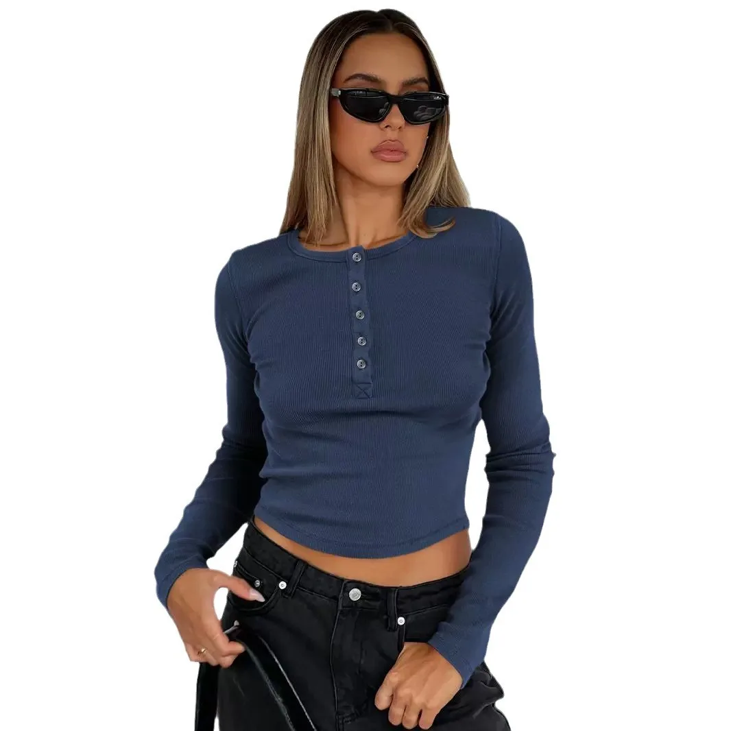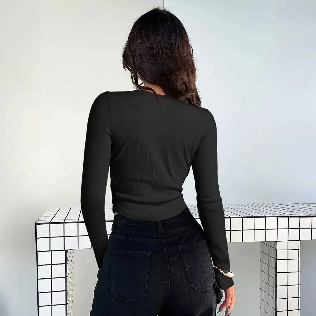 Y2K T-shirt Woman Ribbed T Shirt Button Slim Fit Long Sleeved Knitted Shirt Spicy Girl Tee Top for Summer